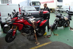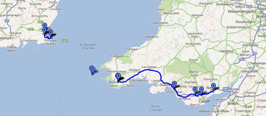 via de brug weer terug. Tot rond de middag kunnen we met droog weer rijden en daarna veranderd het via mist in alweer regen. Mooi op tijd komen we bij de boot aan. Eerst worden de motor's goed vastgezet en daarna kan de 4uur durende oversteek naar Ierland beginnen. Eenmaal in Ierland merken we dat we hier gewoon met Euro's kunnen betalen en dat de snelheidborden ook in Km/h zijn. Na alweer een stevig avondmaal besluiten we nog even de "stad" Wexford in te gaan voor een biertje. |