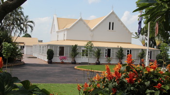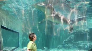 er dan ook uiterst modern uit. Ons hotel ligt naar onze mening een beetje uit de richting van het centrum. We lopen de hele Lameroo Beach af en komen zo uit bij het Parliament en Government House. Bekijken de haven vanuit de Survivors lookout en dan naar Crocosaurus Cove. Hier zal Laura van onze groep in de Case of Death bij de ECHT grote krokodillen gaan. Gelukkig is er een dikke plastieken plaat tussen haar en de crock. Het is een park vol met krokodillen en andere reptielen van Australië en daarbuiten. Het gedeelte met de schilpadden valt een beetje tegen. Daarna lopen we met Sanne en Laura naar Stokes Hill Wharf om hier de haven te bekijken en te genieten van het avondeten. |