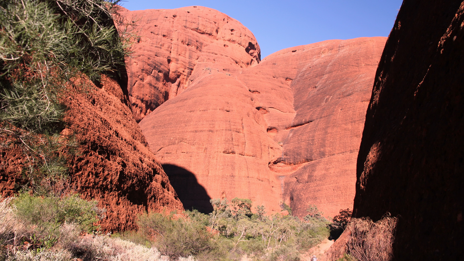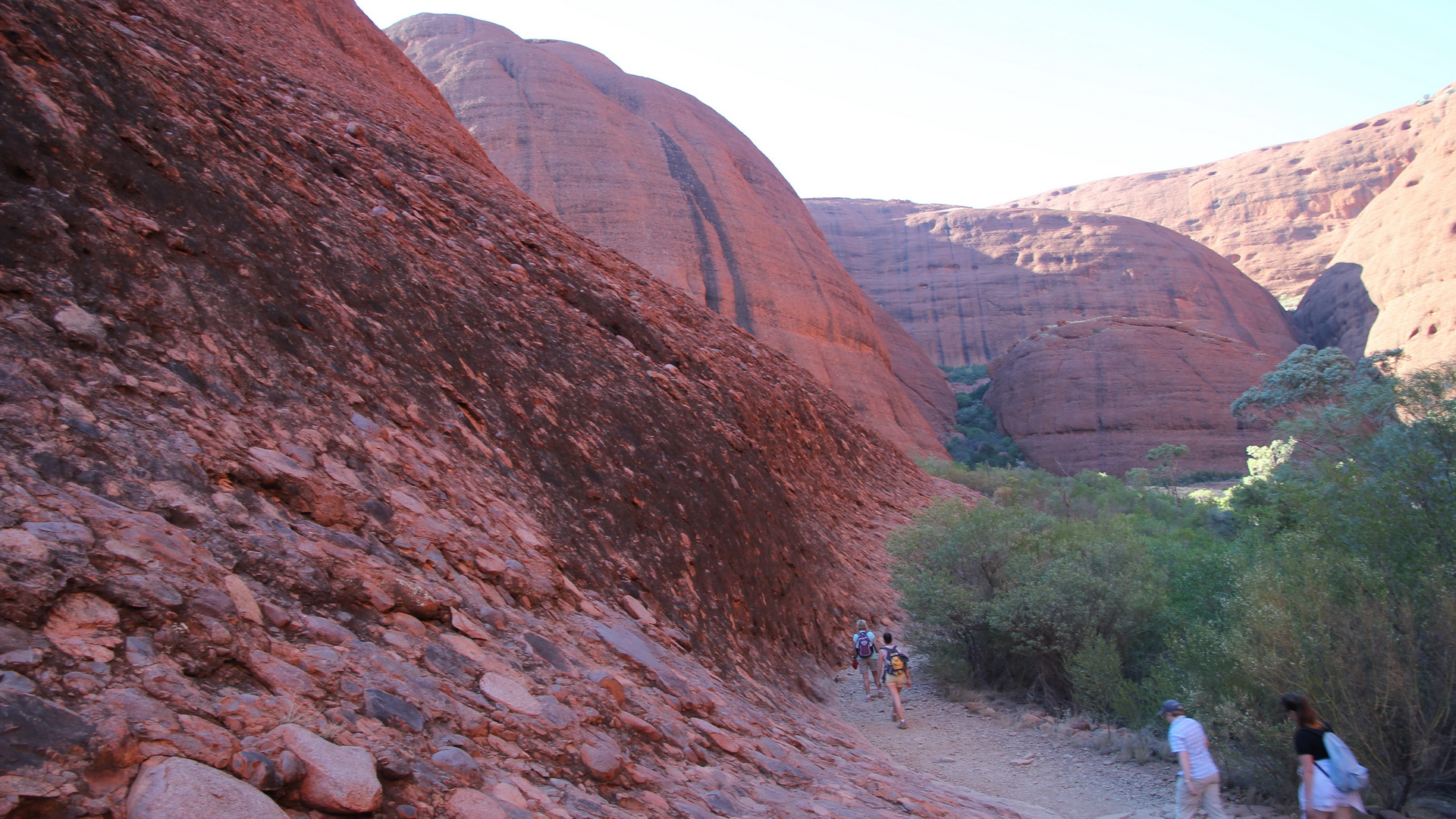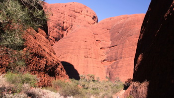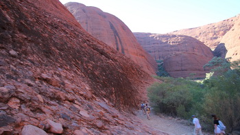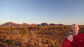 dan Ayers Rock Nadat de nodige foto's hier gemaakt zijn vertrekken we voor een stevige wandeling door en rond de Olga's. Een route van ruim 8km met diverse pittige klimmen. De geleende Camelbak (thnx Steven) doet weer goed zijn dienst om genoeg water mee te nemen op de tocht. De grote rotsformaties lijken wel te bestaan uit "standaard maaskeien" die dan met rode cement tot een grote massa zijn gemaakt. Rond middag zijn we terug op de campground en doen we gezamenlijk lunchen, daarna is de middag vrij te spenderen. Mike gebruikt dit om zijn liefste hobby uit te voeren. Kathleen gebruikt de Hotspot van de chauffeur om via internet wat emails en berichtjes te versturen. Samen maken we ook van de tijd gebruik om onze voorraad schone was weer tot aan de beginvoorraad aan te vullen. We kunnen nu tot het einde van de vakantie uitzingen. In de late namiddag is er een optionele tocht met een wandeling naar de Uluru (Ayers Rock). Kathleen gaat mee, Mike gebruikt deze tijd om de website en de foto's bij te werken. |