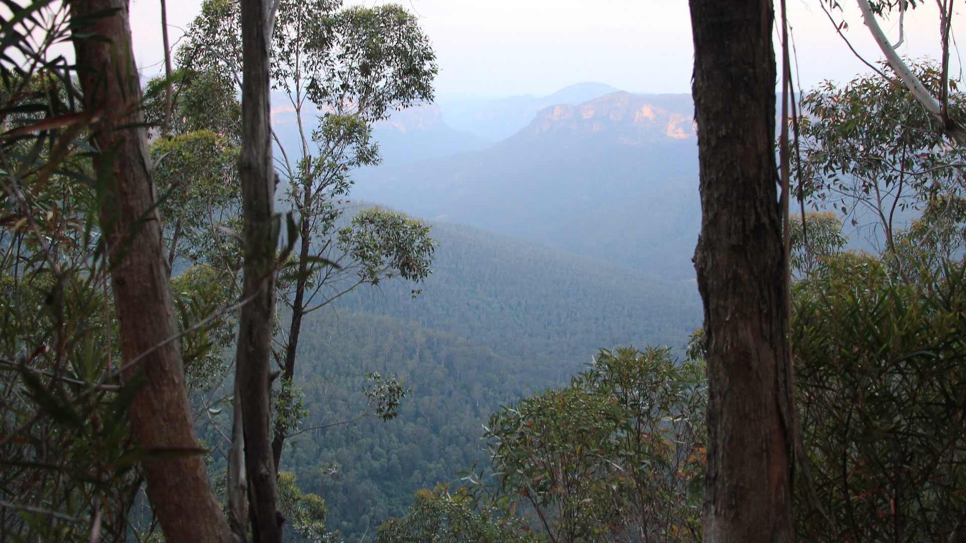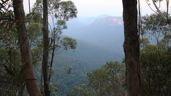 !!! Daarna rijden we naar het Parlement gebouw en na een controle via de Xray mogen we binnen alles bekijken, oa waar Senaat en Parlement vergaderen. De tussenstop in de namiddag is aan de rand van de Blue Mountains bij een "cave". Wij kennen echter diverse grotten zoals oa de van Ham en vandaar dat dit niet zoveel verassend was voor ons. Deze was wel ruimer en bevolkt met vogels. Tegen de schemering mogen we dan al een blik werpen op de canyons van de Blue Mountain en inderdaad hangt er een aparte blauwe damp tussen de stenen rotsen. |