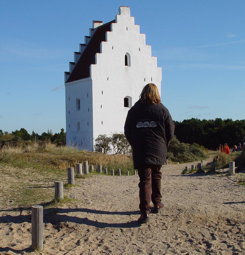 ons doel.Vlak voor skagen ligt een kerk die door het zand