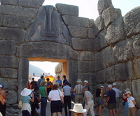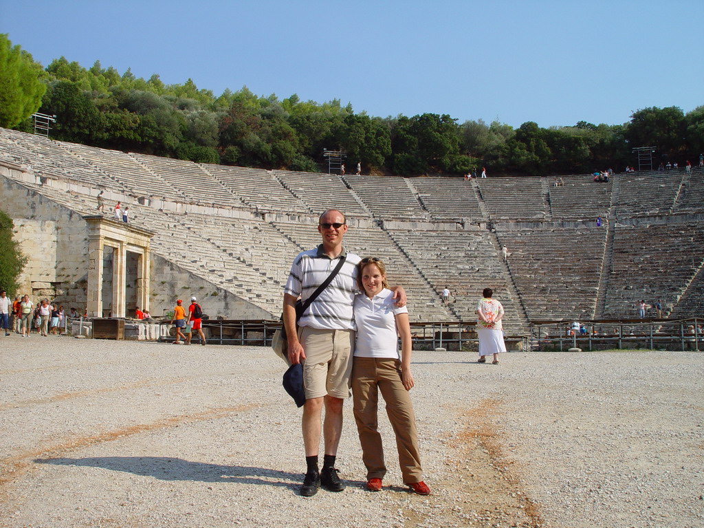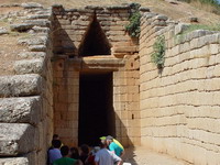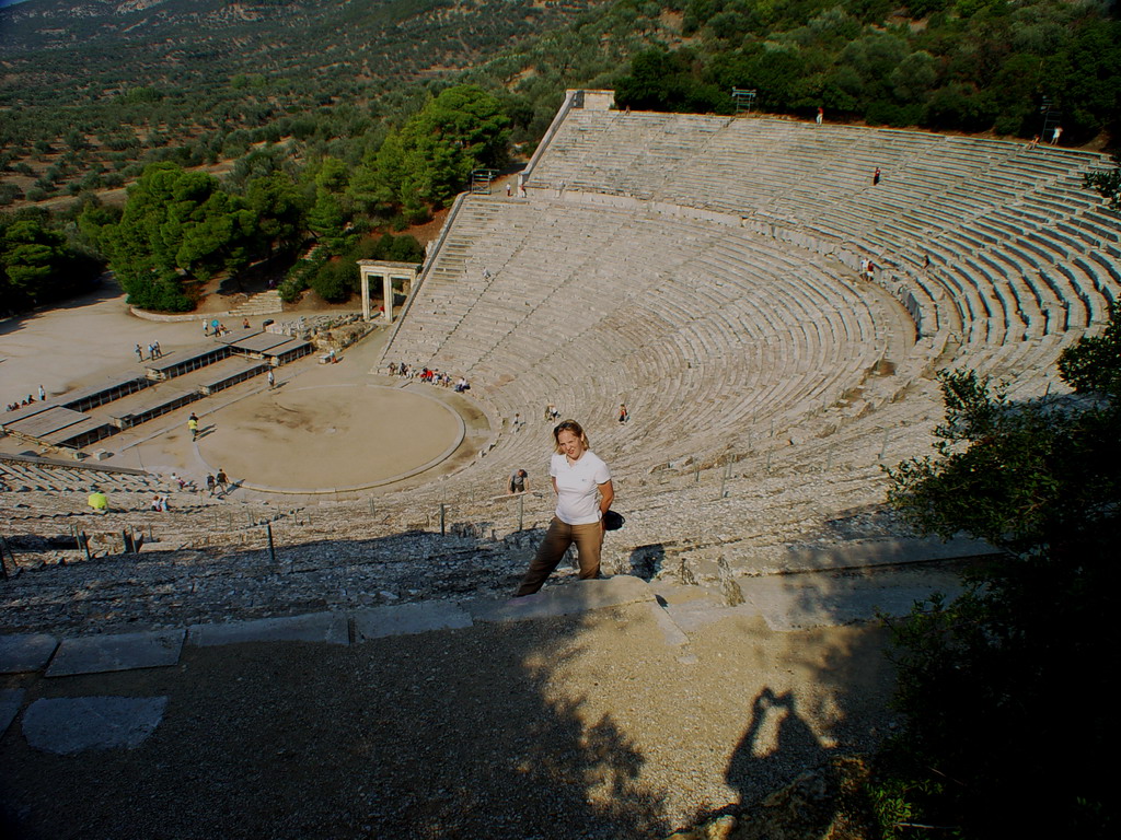 kwestie van gokken voor de juiste richting. Ook vandaag was dit weer het geval. Na 1,5 uur rijden komen bij het kanaal van Korintie. Een 6,5km lang kanaal dat 85m hoog is en dan nog eens 8m water diepte heeft. Het voordeel van dit kanaal is buiten een korte afstand van meer dan 300km ook geen risiko van ondiep water of rovers in vroegere tijden. Voordat het kanaal er was werden de boten ook al over land getrokken !! Daarna zijn we vertrokken richting Mycanea voor eerst een bezoek aan de reuines van een kasteel en het bezoek van de graf-tombe van waarschijnlijk de koningen (van rond 2000 B.C.) De platte drager boven de opening is een grote steen van 100 TON !! en de driehoek is gemaakt om de druk van de koepel niet op de steen te laten rusten, maar via de zijkanten af te voeren. Hierdoor is de kant dat de ingang instort veel kleiner. Dit is van belang omdat dit graf telkens opnieuw gebruikt werd. Onze laatste tussenstop was er een waar vooral Kathleen naar uit gekeken heeft. Het bezoek aan het grote theater van Epidaurus. Akoestiek is goed: Luister maar De plek was vroeger eerder bekend als een soort "heal" of kuur-oord. Men kwam naar Epidaurus indien men gezondheidsproblemen had. Een combinatie van 3 zaken zorgen voor de genezing van vele mensen. A) Rust en ontspanning (ook door sport) B) Magische krachen in kelders van gebouwen C) Priesters die "geneesmiddelen" toedienden. Het theatre is er toevallig ook, maar had geen vaste betekenis in het genees proces, buiten dan een eventueel ontspannend effect. |