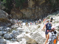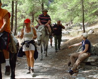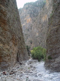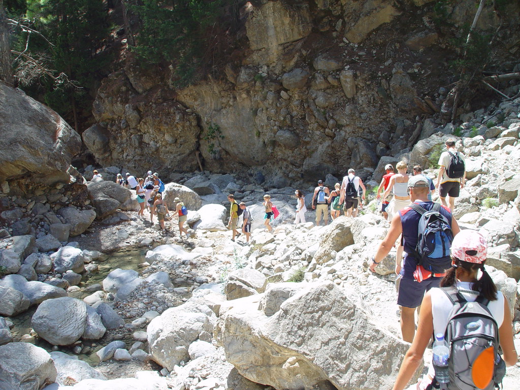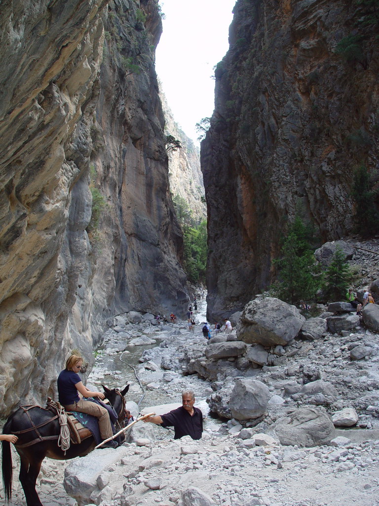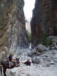 om 6:55 kwam halen... Via talrijke tussenstops een complete dubbeldekker vol aan mensen opgehaald en daarna richting de top van de samaria kloof gereden. Om 10u werd voor ons het startsein gegeven om aan de tocht van 16km te beginnen. De kloof begint op 1200m en in de eerste 7 km moet je er 900m dalen. Dit stuk is tevens het zwaarste stuk van de tocht. Kathleen had op diverse stukken een beetje bang om uit te glijden en daardoor wandelde we exact volgens de minimum snelheid. Het probleem is echter dat we om 18u onderaan de kloof moeten zijn, omdat dan de laatste boot vertrok. Halverwege (in het dorp Samaria) bleken we volgens de timing exact op 18u aan te komen. Dit vond de gids (en wij) riskant en daarom hebben we gekozen om kathleen een stuk met de muilezel te laten doen. Deze houdt een vast tempo aan dat hoger ligt als ons loop/klouter tempo. Zo gezegd zo gedaan, kathleen wordt op de muilezel geholpen en de tocht kan verder gezet worden. Kathleen vond het een hele ervaring om op een 1pk te mogen rijden. Op 11,5km kwamen we een persoon tegen die gevallen was en moeilijk kon lopen. Kathleen heeft toen haar ezel af gestaan aan deze persoon. Wij hadden tegen die tijd genoeg tijd gewonnen om ook de tocht op eigen snelheid te halen. En jawel om 17u kwamen we onderaan de kloof eruit. Moe maar weer een ervaring rijker. |