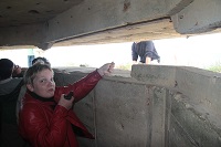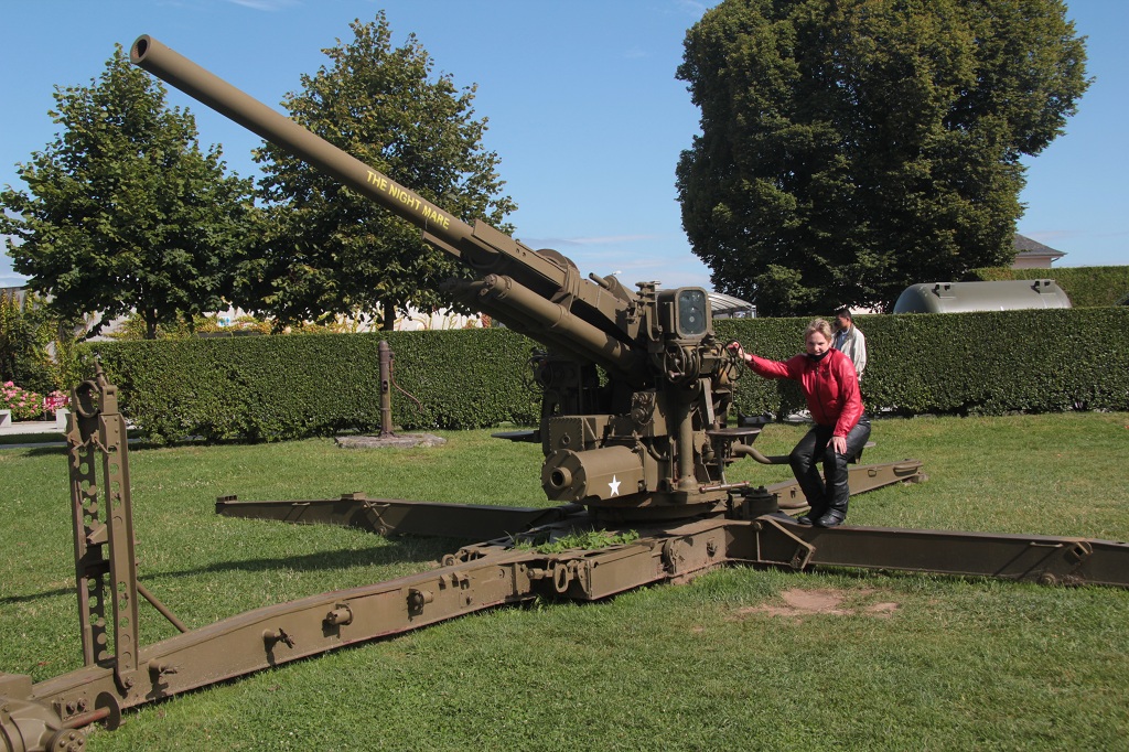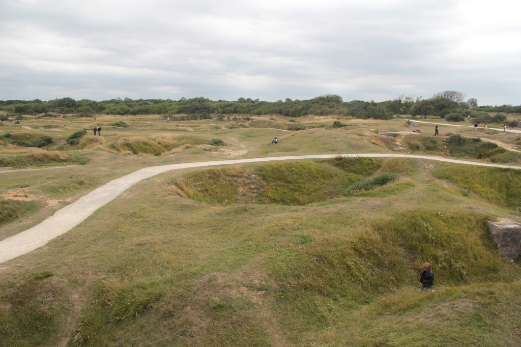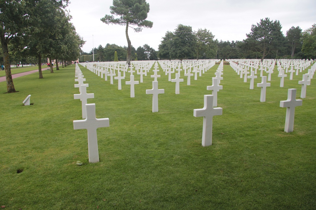 parachutist die hier aan de kerk hangt. Vlak erbij ligt ook het Airborne Museum die zich toegespitst heeft tot de parachutisten die hier voor D-day geland zijn. Via Iron Mike (we hadden ons hier iets anders verwacht) richting Point du Hoc gereden. Bij aankomst bleek de batterij van de camera leeg te zijn, dus even terug naar het huisje om een nieuwe te halen, dju kost toch weer 1,5 uur.... maar het is een indrukwekkende plek. Het zou zo een maan landschap kunnen zijn met al die kraters. Ik ben ergens erin gaan staan, en hand opgestoken en dan was ik nog niet te zien !!! In de late namiddag nog naar het Amerikaanse kerkhof gereden. Van Normandië is dit veruit het grootste kerkhof. Alles kaarsrecht en veel informatie. Hetgeen ons opvalt is dat ook dit weer volledig gratis is. |