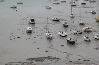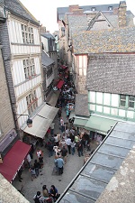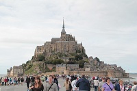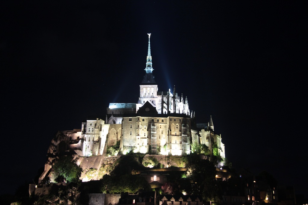 de regenpakken uit gedaan hebben. Ondertussen waren we aangekomen in Granville. Ook hier stond de haven droog door het terugtrekken van het water. Een apart gezicht als je de zeilbootjes met hun kiel ziet vastgeprikt zitten in de modder eronder. We vervolgen onze weg richt Mont Saint Michel. In de baai aan de overkant parkeren we de motor en bekijken we over de grasvlaktes de 2 heuvels waar Mont Michel er een van is. Toevallig of niet lagen hier ook 2 geocaches..... Vanaf hier was het toch nog ruim een uur om de hele baai heen rijden voordat we in de buurt van de Mont Michel kwamen. Met de motor kunnen we gelukkig langs de lange file op de dijk doorrijden en zo komen we in de namiddag aan. Leuk is dat je vrij snel rechts omhoog kunt naar de 1e wal. Van hierboven op heb je enerzijds mooi zicht op de baai en de dijk, anderzijds zit je niet zo vast tussen het volk in de nauwe straatjes die vol zijn met winkeltjes en restaurants. In de avonduren nog even terug voor een nightshot. |