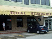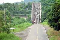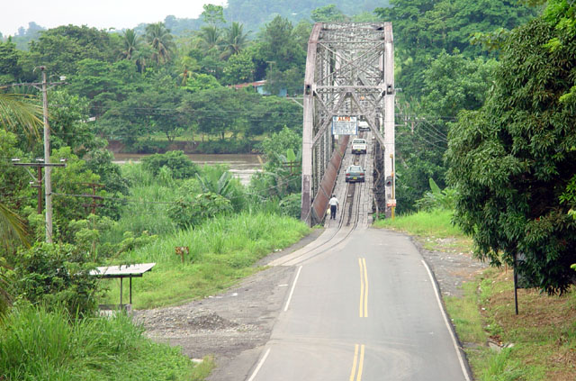 prachtig om te zien. Om daar weg te komen moet men eerst het hele dal terug rijden tot aan David. Hier hebben we de tickets gekocht voor de terugvlucht naar Panama a.s. woensdag middag. Om morgen zo vroeg mogelijk in Bocas del Toro te zijn hebben we onze planning aangepast en zijn helemaal naar boven gereden tot aan changuinola (Hotel Semiramis). Onderweg komen we een heel aparte brug tegen. We verwachten dat er geen geld was om een extra brug te bouwen voor de auto's, vandaar dat ze de treinbrug een beetje aangepast hebben. Apart ! Hier zitten we nu in een Cafeetje te internetten. De mensen kunnen het niet geloven dat wij "Internet aan het maken zijn". |