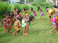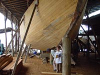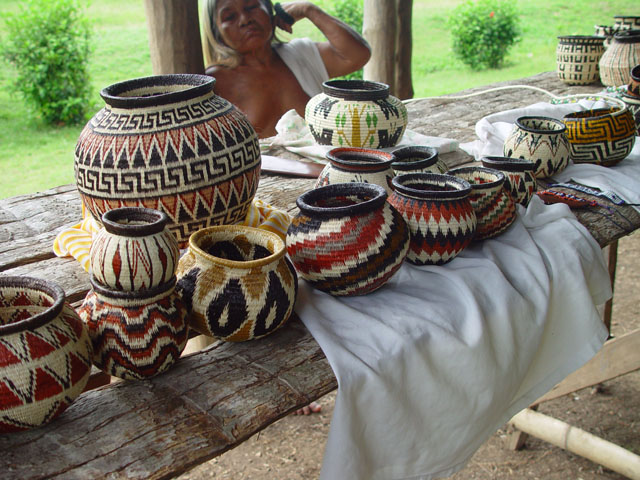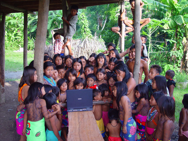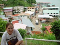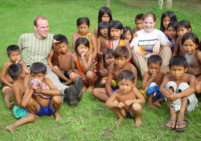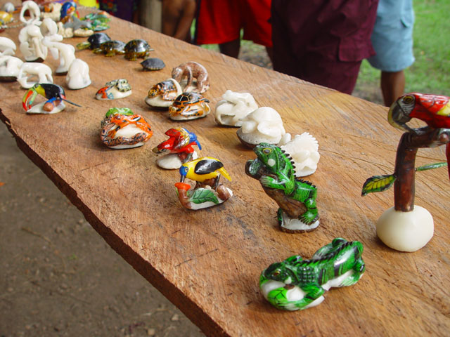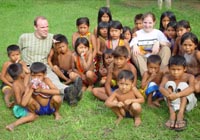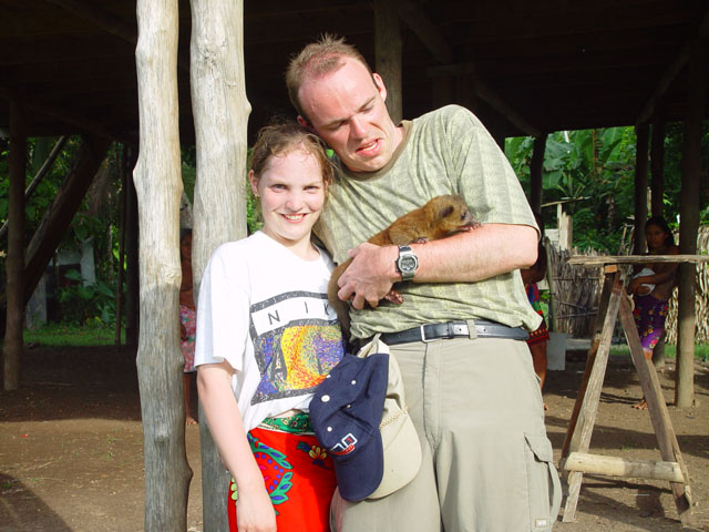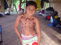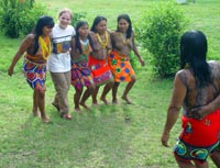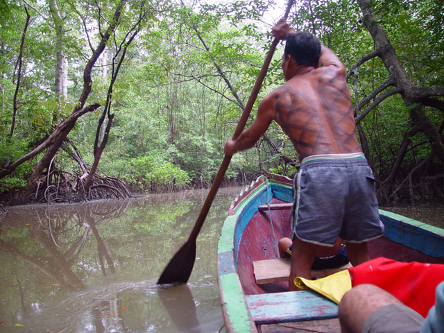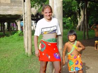 niets van en doet zijn ogen pas rond 8:30 open. Ontbijt is ei met eigen gemaakt vers brood, zo lekker dat je dit zonder jam of vlees kunt eten. Als eerste krijgen we een uitleg en demonstratie hoe de mensen daar mandjes en beeldjes maken. Nadat ze hun kunsten getoond hadden mochten wij ook proberen. Moeilijk hoor. De mandjes worden zo strak gespannen dat er zelfs geen licht doorkomt. De beeldjes worden gemaakt van "tague", een vrucht van een boom. Deze is zo hard dat je ze met houten beitels moet bewerken, lijkt wel op ivoor (maar dan kunst). Hierna was het spullen pakken en klaarmaken voor een tocht van 25 km rivier afwaarts. Gedeeltelijk met de buitenboord motor en gedeeltelijk op de ouderwetse manier. Peddelen. Doordat het verval met de open zee zo klein is heeft men zelfs eb en vloed in de rivier. Op de terugweg lag dit stuk dus 1 meter boven het water! Onderweg natuurlijk veel planten en dieren gezien. Het eerste dier is een Pelikaan. De tweede weten we de naam niet meer van. Hij was er in 2 soorten. Een met zwarte snavel en de andere met een rode. We meerden net buiten de stad aan, waar een verassing op ons stond te wachten. In een stal stond een huus zeilschip in aanbouw. Een rijke Amerikaan uit NY had 3 miljoen over en liet zich hier een bootje bouwen. Het frame wordt gemaakt van zogenaamd "Iron wood". Je kunt dit enkel bewerken met metaal boren/zagen. Dit is speciaal hout dat hier in Darien groeit. De stuctuur is zo speciaal doordat het groeit in een combinatie van zout water en bij vloed in zeewater. Kortom het combineert van beide de voordelen, voor ons was het enkel heel zwaar. Vandaar was het 5 min wandelen naar de hoofdstad van het natuurpark Darien: La Palma. Één straat van 250 meter en dan heb je het gehad. Stelt dus echt niets voor. Mooie bloemen waren er wel te zien, we hebben deze dan ook maar gefotografeerd. Van dit soort zijn diverse kleuren combinaties mogelijk. Na weer 25 km rivier opwaarts komen we weer terug in ons indianendorp "Puerto Lara". Hier werden we verrast door iets speciaals, iedereen had zijn kunstwerken uitgestald en het was aan ons om te kiezen wat we wilden hebben (tegen betaling). Het hoofd van de commune houdt dan bij wie wat gemaakt heeft en diegene krijgt dan ook zijn geld. Zodoende heeft iedereen een gelijke kans en wordt het geld eerlijk verdeeld. Nadat we onze keuzes gemaakt en betaald hadden werden er groepsfoto's gemaakt. Vooral de kinderen wilden maar al te graag met ons op de foto. Hierna werd een trommel uitgehaald en begon men voor ons te dansen volgens hun originele traditie. Al snel werd Kathleen erbij betrokken en had men veel fun (hè Kathleen). In het filmpje wordt dit goed duidelijk. (Primeur dit jaar, MOVIES !!!!) De dans is in principe simpel, maar door de warmte en hoge vochtigheid toch loodzwaar. Het schouspel van de vrouwen duurt daarom ook maar 15 min. Hierna zijn de kinderen aan de beurt. Een fluit komt bij de trommel en ook zij laten hun kunsten zien. Kort daarna is Mike zijn Kathleen kwijt, een huisdier wordt uitgehaald. Een zacht beestje met een enorm lange tong. Even daarna is Kathleen weer terug, met een rokje aan. Sorry ik moet dit als doek beschrijven, volgens Kathleen, en niet als rokje. Kort daarna is Mike zijn foto geheugen op en moet de Laptop opgestart worden om alles over te zetten. Sommige kinderen worden gek als ze dat zien, vele andere stromen toe. Kort daarna heb ik maar de laptop onder ten toon gezet en zoals jullie kunnen zien kijkt het halve dorp naar dit 9e wereld wonder. Tovenaar Mike lijkt het wel. Als laatste dat we die dag te zien krijgen is hoe de mensen zich hier beschilderen, met een of andere blauwe verf is dit meisje volgens hun patronen beschilderd en toont trots het resultaat. Hierna is het douchen en weer genieten van een heerlijk avondmaal. Voor de genieters was er punch, rum en wijn. Mike dronk vers cocosmelk en mango sap. Je vindt het hier normaal dat je om 20:30 gaat slapen. Rond 19:00 is het compleet donker en het dorp gaat dan slapen. Na een drukke dag in de buitenlucht heb je dan ook geen problemen om in slaap te komen. Welterusten. |