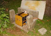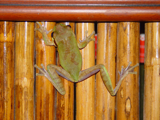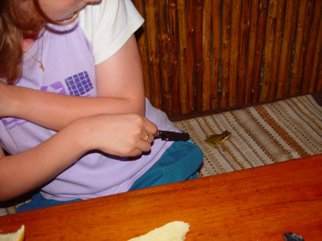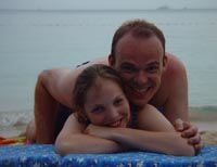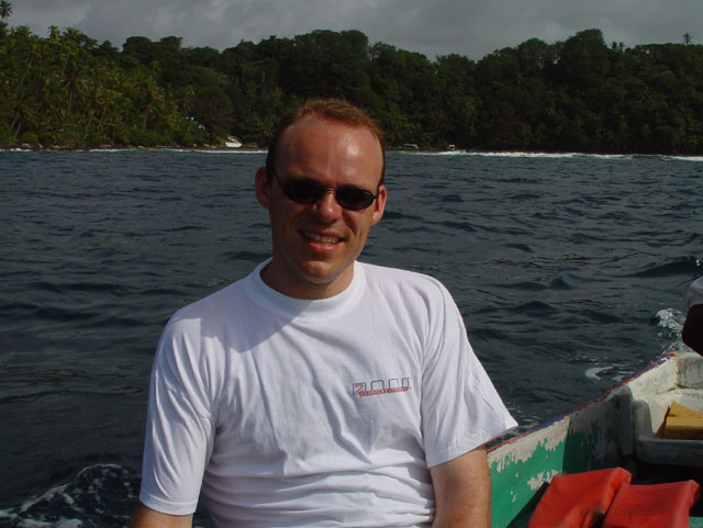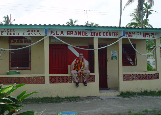 de rest van de middag. Bij het ontbijt de volgende morgen hadden we er plots een huisgenoot bij. 15 cm naast Kathleen valt er een boomklever van het plafond. Even schrikken, maar daarna wel grappig. Na het ontbijt wil Mike toch een cocosnoot hebben. Na veel missers heeft hij er toch eindelijk een te pakken. Na 10 min wringen is de noot uit zijn schaal en kan er een gat ingeslagen worden. Het vocht wordt netjes opgevangen in een beker en daarna met een servet gezeeft. Zo nu kan het genieten beginnen denkt hij. Helaas, zuur sap. Bha 2 uur voor niets geploetert. Rond 15:00 krijgen we een boottochtje om Isla Grande. Het tochtje duurt ongeveer een uur en was aardig. Nadat de man (die enkel Spaans sprak) ons afgezet had, vertrok hij zonder geld te vragen. Apart! De laatste dag op het eiland hebben we gebruikt om een bezoekje te brengen aan de vuurtoren. Niet volledig officieel kun je naar binnen en helemaal tot in de top klimmen. Van daaruit heb je een schitterend uitzicht over het eiland, vaste land en de caribische zee. Het einde van de dag wordt gebruikt om op het strand de zonsondergang te kijken, door de bewolking helaas niet mogelijk. Tja dan maar een fotootje van ons (liggend op het strand). Als laatste nog een korte beschrijving van de capriolen die we met onze generator hebben gehad. Het begon al met de installatie en uitleg. Sjef liet bij aankomst alles mooi zien en legde vanalles uit, zo ook hoe de generator werkt. Met deze kunnen we licht en ventilators aansturen. Nadat Sjef uitgelegt had hoe je zo'n ding verankert, vult en aansluit mocht ik hem starten. En jawel hoor Mike trok hem in een keer aan, en tegelijk ook de kabel over. :( Na wat gevloek, gekeken wat eraan scheelde. Het bleek dat alles nog werkte, indien je de kabel manueel oprolde. Hiervoor moest je wel een zijpaneel telkens los- en vastschroeven. Puf, puf wat een werk, en dat in je vakantie! Het ergste komt echter nog. De 2e dag wou Mike slim zijn en vult de generator 's morgens al bij en rolt de kabel al netjes op. Zodoende hoeft hij 's avonds deze enkel nog aan te trekken. 's Avonds stond echter een rotte constatering te wachten. Mike had vergeten de benzinekraan dicht te draaien en met als gevolg dat de machine volledig verzopen was. Ai ai ai wat nu? Na zeker 20 keer vergeefs geprobeert het ding vlot te trekken besluit Mike maar met grof geweld eraan te gaan. Alle panelen worden losgeschroeft en een "Hoe repareer ik een motor?" snelcursus wordt gestart. 1)Benzine toevoer moet gestopt worden, dus eerst benzinetoevoer zoeken en daarna aftappen. 2) Een ander zwart kastje gaat ook naar de motor, na openschroeven blijkt dit de luchtfilter te zijn. Hier haal ik ook een theekopje benzine uit. Alles open laten liggen. Nu moet het werken, en ja hoor de 2e keer springt het ding aan en loopt zonder benzine zeker nog 5 minuten. Dan valt hij uit. Ondertussen is Mike klaar met zijn vreugdedans en Kathleen begint te geloven dat er vannacht nog frisse lucht zal komen. Na alles netjes teruggezet te hebben en opnieuw benzine gevult te hebben draait het machientje de rest van de nacht. Extra moeilijk was dit alles doordat er geen licht was, enkel een zaklantaarn gaf wat licht om te werken. Laten we het erop houden eind goed al goed. |