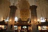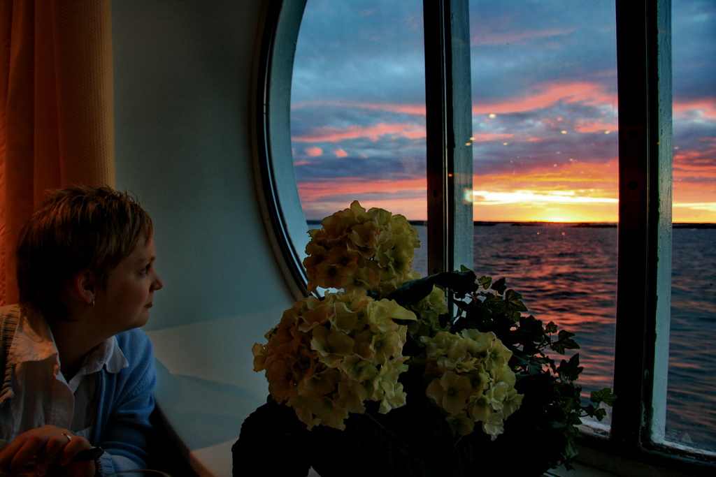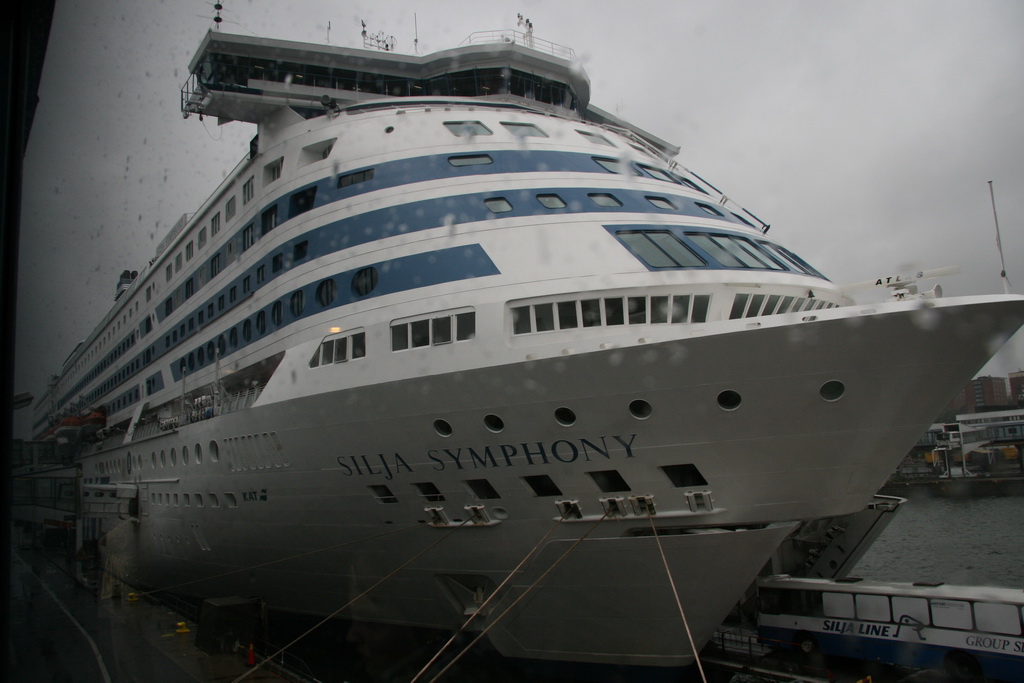 regendag gehad hebben. We zijn begonnen met een wandeling naar het oude stads gedeelte (Gambla Stan) om daar de geplande zaken te bekijken. Als eerste zijn we door de Riksdagshuset gewandeld. Enkel buro's zonder speciale zaken. Ook het koninklijk slot (Kungliga Slottet) is van de buitenkant niet veel soeps. Een combi ticket gekocht om alle zaken binnen te kunnen bekijken (en droog). Binnen was veel te zien en de moeite waard. Daarna naar de Tyska kyrkan, deze is ook van binnen de moeite waard om te bekijken. Volgens de boekjes moest er ook een Viking boot liggen, maar ik denk dat ze daarmee op reis waren. Nergens te vinden. In de namiddag naar het eiland voor het Riddarhuset en de Ridderholmskyrken, maar dat viel allemaal tegen (waarschijnlijk ook beetje door de regen). Vandaar dat we het laatste uur wat rondgewandeld hebben in shopping centra á la Harrods. Ten slotte nog snel de spullen op pikken op ons hotel en richting de vertrekplaats van de boot. Silja line brengt ons met de boot Symphony van Stockholm naar Helsinki. Naar ons gevoel een cruise boot, met leuke cabin en diverse attracties vermaken we ons tot in de late uurtjes. Van Tax Free shopping, heerlijke restaurants, casino tot Dance club alles was voorzien. Vooral het eten met uitzicht op de ondergaande zon vond Kathleen een super moment. |