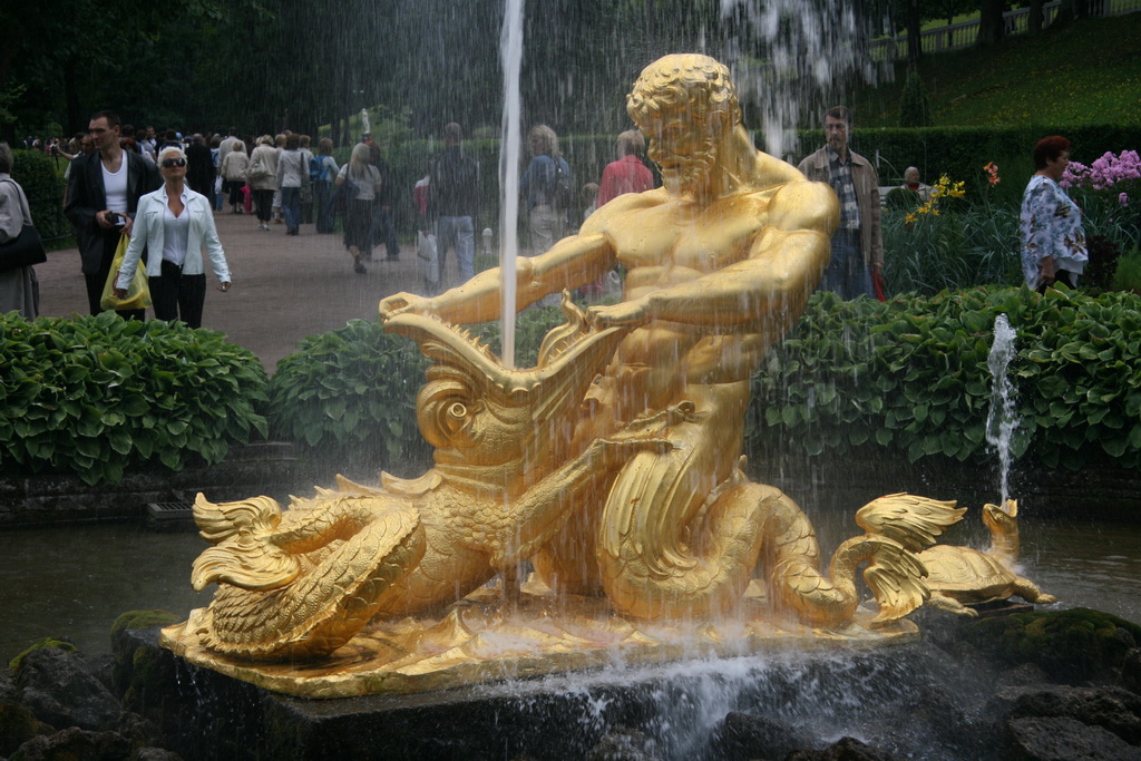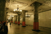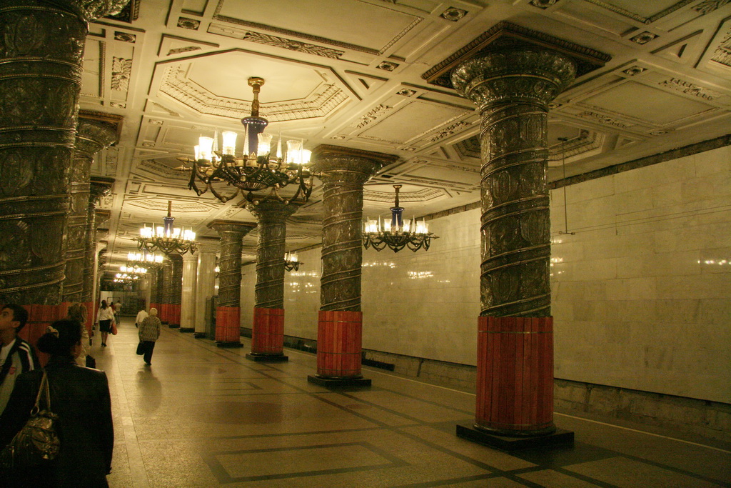 minivan die pas vertrekt als alle stoelen vol zijn. Eenmaal aangekomen is de eerste blik een beetje teleurstellend. Een redelijk sober Paleis met slecht onderhouden fonteinen in het Hoge park. Om de hoek een Full kaartje gekocht en dan naar de binnenkant van het park. Whaaw. Een adembenemend schouwspel van Water goud en groen. Dit mag inderdaad een toplocatie worden genoemd. Helaas bleek het full kaartje niet full te zijn (dat hadden we gisteren ook al bij P en P vesting gemerkt). Na 30 minuten aanschuiven blijken we in een rij te staan die enkel voor russen geldt, en wij moeten ons ergens anders melden, waar kan niemand je vertellen. Uiteindelijk toch gevonden (groeps ingang) en daar betalen we voor het eerst (naar onze mening) teveel voor het bezoek van het Paleis. De wandeling door het park is heerlijk. Wind, water, en muzikanten hier en daar maken het echt af. Af(gelopen) was het nadat we een stortbui op ons kregen. Op dat moment waren we aan het twijfelen of we zouden gaan, maar dat maakte de beslissing makkelijk. Goed doorweekt zoeken we een bus die richting city vertrekt. VOL gepropt met natte mensen vertrekken we met een lokale "bus". Kathleen herkent dat we de goede richting uit gaan. 30 minuten later stoppen we bij een halte waar we ook een metro zien. Uitstappen en omstappen is dan snel de keuze. Ook dit metro station is weer geweldig om te zien. |